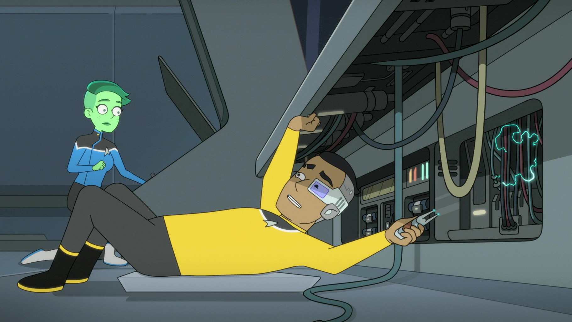 | Various isolinear optical chips, early scanners and PADDs, a tricorder and isolinear circuitry (similar to the one first seen in "11001001", identical to the one in "Contagion") appear in this shot. The tool with the forked tip started its life as a medical device in Dr. Crusher's case. Decades later, it appeared in animated form on Lower Decks. | ![]() "Lonely Among Us" |