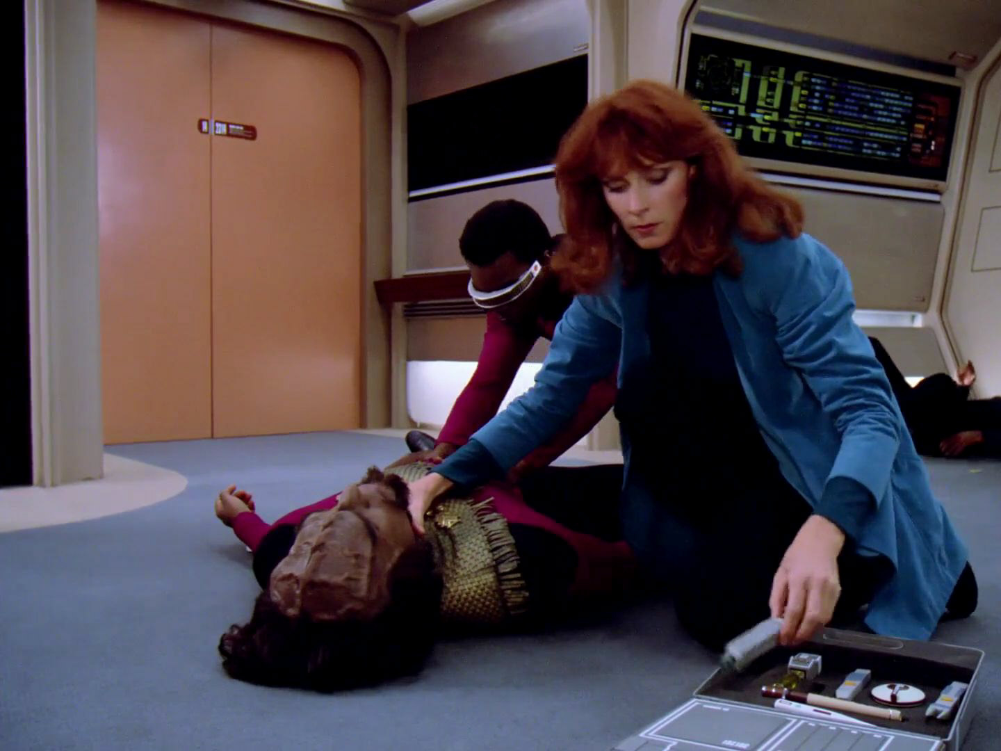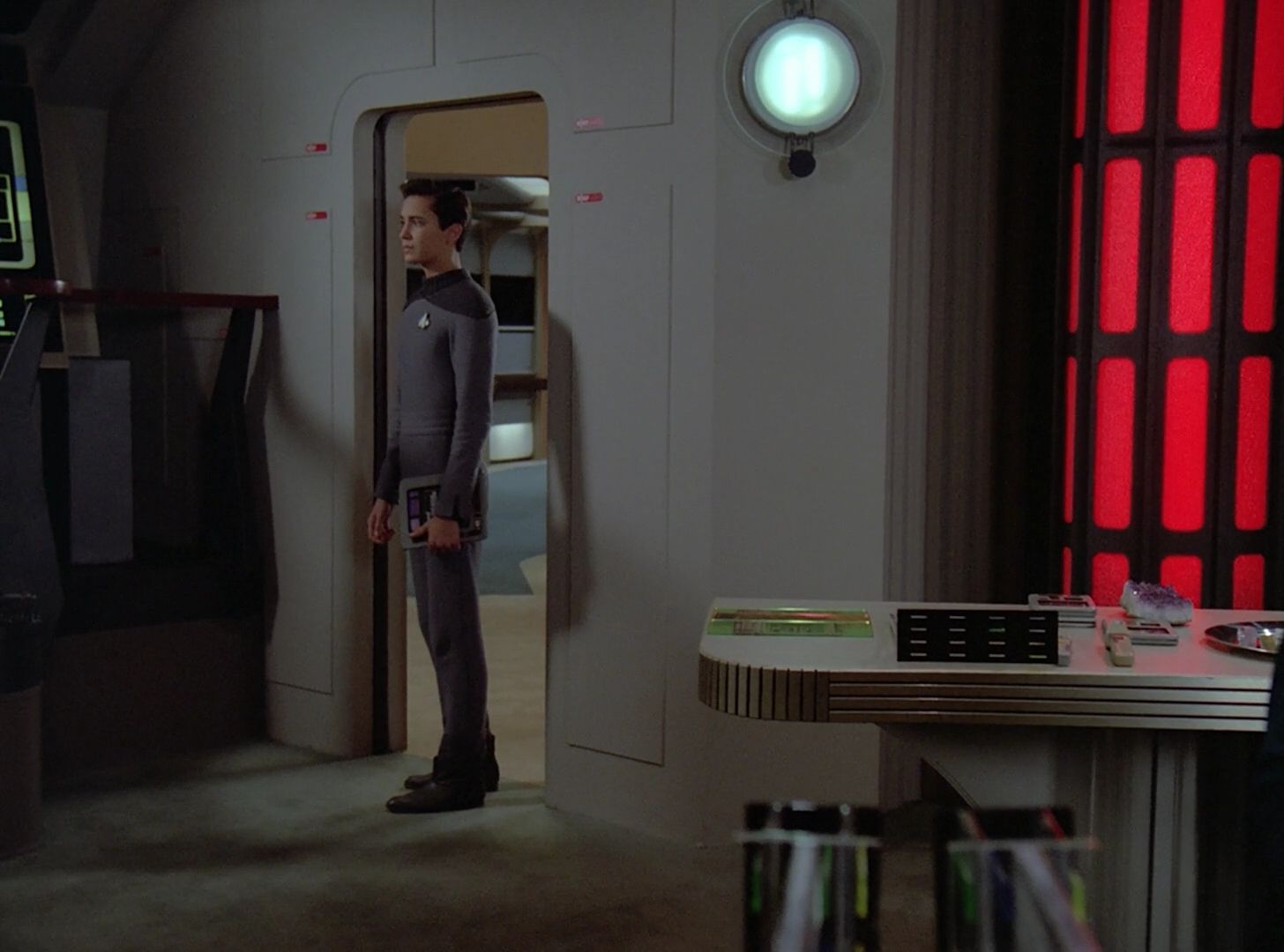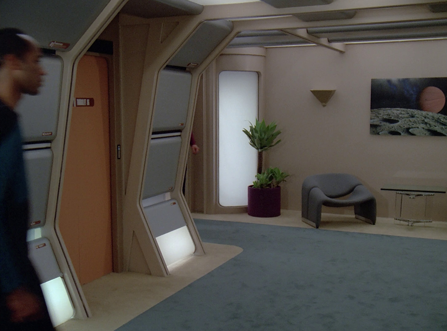| Wesley says that his team of geophysicists is waiting behind the door. When he finally enters the room, after talking to Doctor Pulaski, it can be seen that the room has green walls. That is because he actually enters Troi's office, first seen in the previous episode "The Icarus Factor", which is always located opposite the transporter room. | ![]() "The Icarus Factor" |