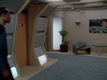 | For this shot of Data's quarters, his desk was turned 90° counter-clockwise for an unknown reason. The LCARS display normally behind Data is now glimpsed to the right of him. The shot is filmed through the open door to the office part of Data's quarters. The comparison screen cap from "The Schizoid Man" shows that the blue carpet originally covering this wall has been replaced by gray ribbing as well. | ![]() "The Schizoid Man" |