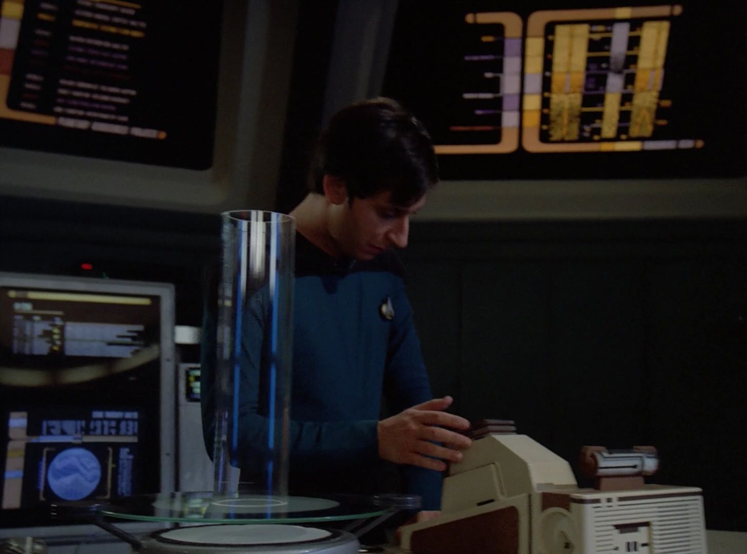 | The console/computer Davies briefly looks into after vaporizing the rock is usually seen in sickbay. It appeared in "We'll Always Have Paris" and "Loud as a Whisper", for example. | ![]() "We'll Always Have Paris" |