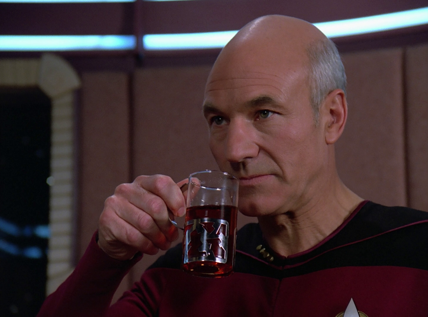 The artist's signature can nearly be made out in this shot of the space station painting in Picard's quarters. The famous Bodum Bistro tea cups debut in this scene. Later in his ready room, Picard will drink tea again, this time from a different cup, also by Bodum, which appears only in "Pen Pals". |