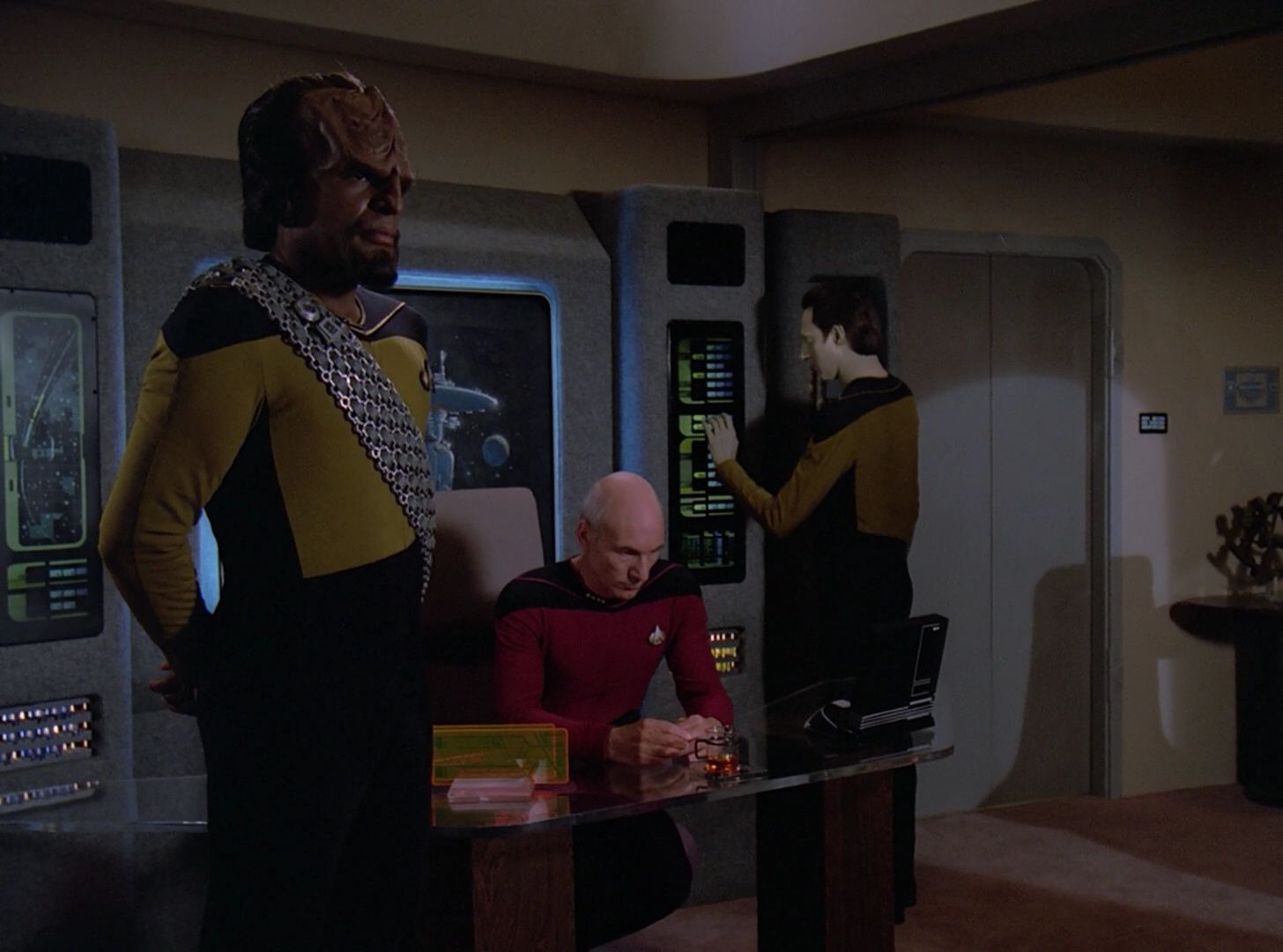 | The door Wesley is seen leaving through was originally the door to the battle bridge ready room. | ![]() "The Arsenal of Freedom" |
