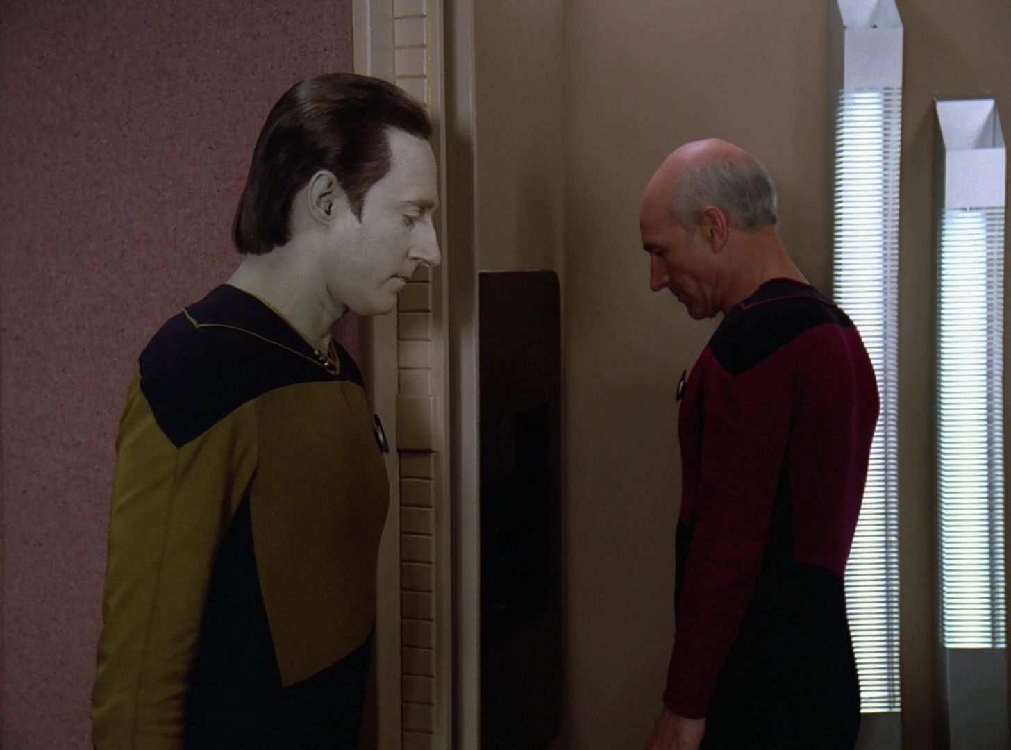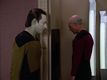 The color of the holodeck door frame changes from beige to gray in the middle of the scene. This was already the case in the original episode but is even more noticeable in TNG-R with its better color reproduction. | ||