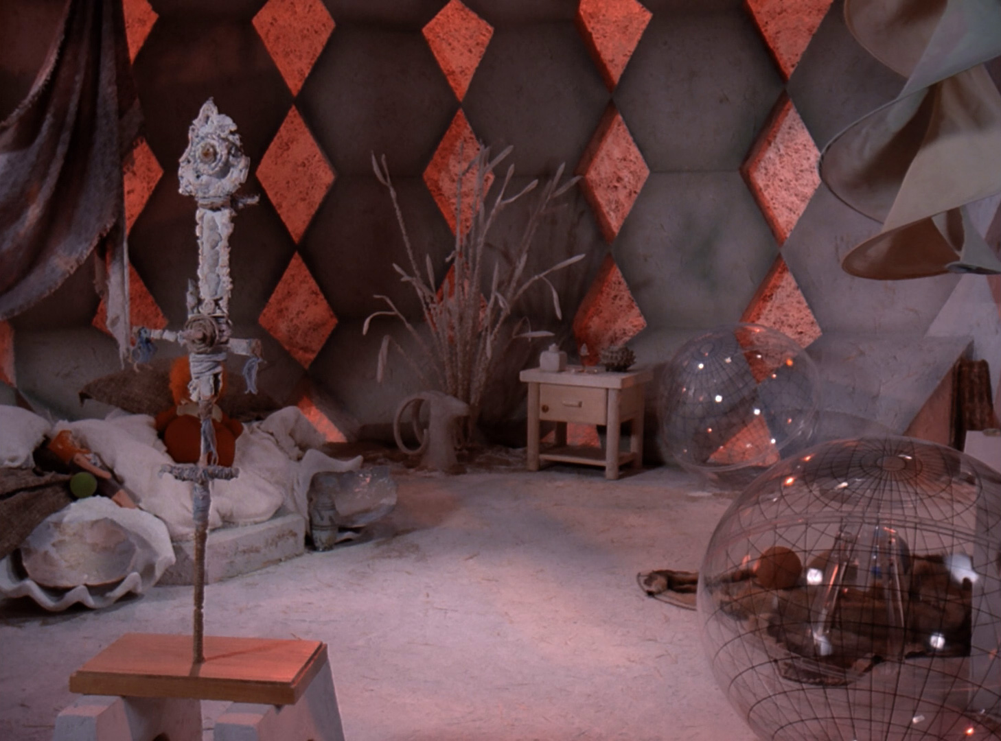 | The two transparent spheres could be Dreman celestial globes, similar to the one seen aboard the Tarellian plague ship in "Haven". Based on the sculpture on the floor, there must also be a horned, goat-like animal on Drema IV. | ![]() "Haven" |