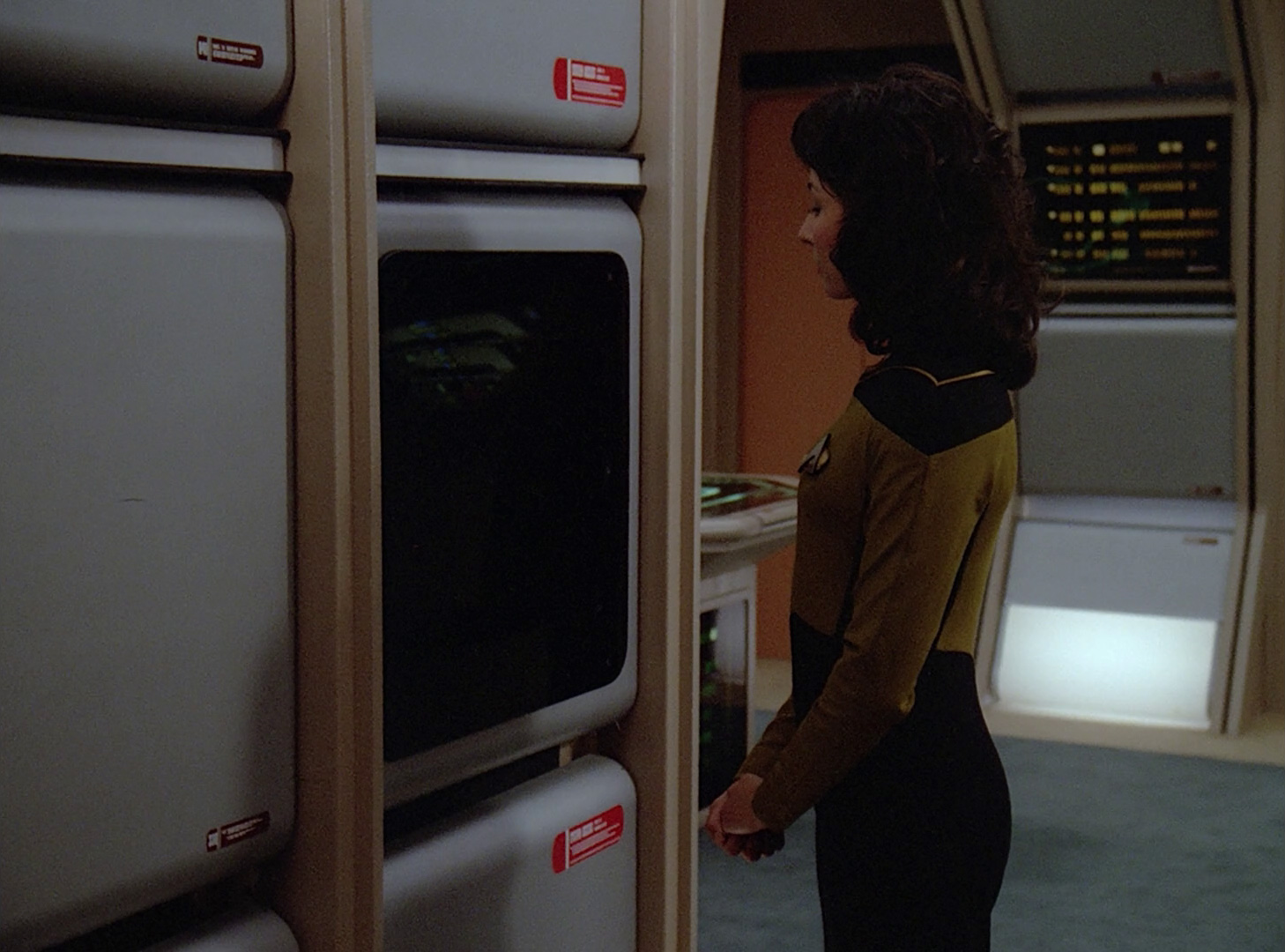 | This shot features the unique Borg interfaces. The covers of 5.25" floppy disk drives are seen at the left side of the screen and conventional drying hoods are seen at the top of the Borg alcoves. |    | |||