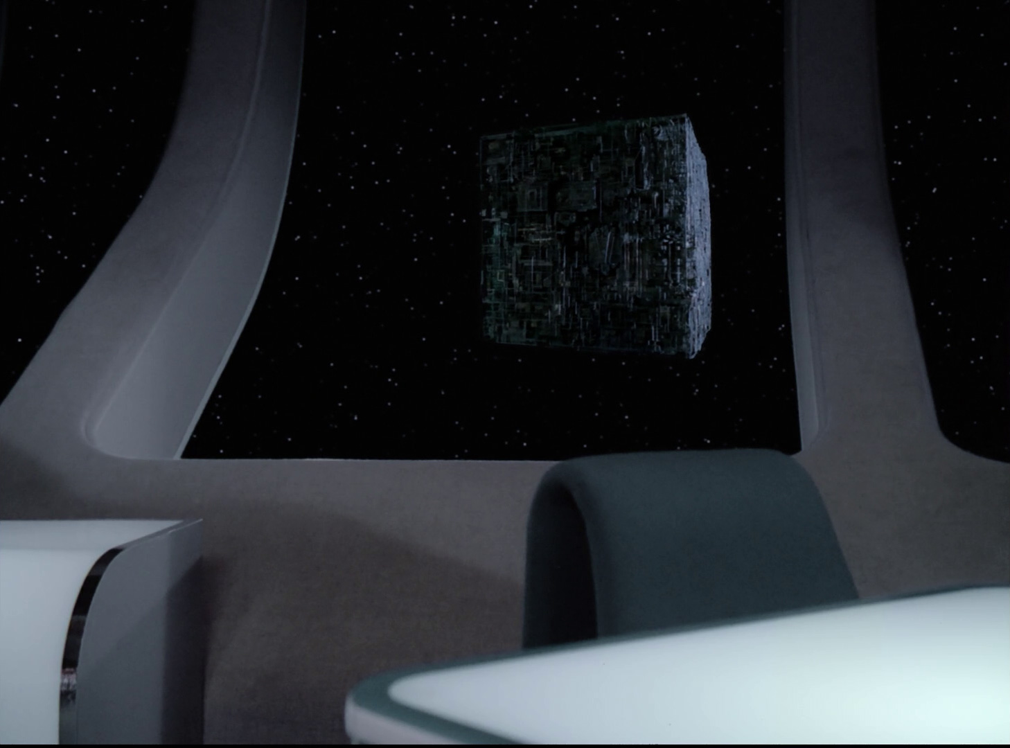 | The Borg cube is seen from a different angle. Comparison with a shot from a slightly earlier scene shows how the ship has repaired itself. |  Earlier in this episode |    | The reconstructed shot in HD. | |