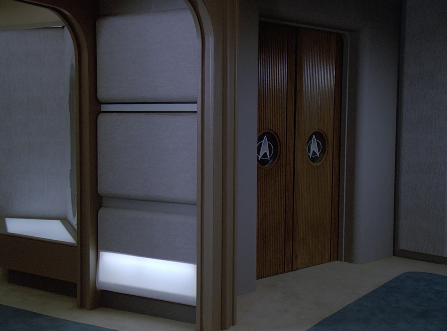 | Guinan's office is a redress of a small part of the senior officers' crew quarters set. In most cases, a bedroom is located in this part of the set. Parts of the room (and the corridor window) can be seen in "The Child", for example. The side door to the set is normally not used, as it is covered by a replicator, a shelf or the bathroom alcove. In season 1, the door was sometimes opened, like in "Justice" when the set served as the starboard lounge. |  Guinan's office floorplan |  "Justice" |  | No changes |  "The Child" |
