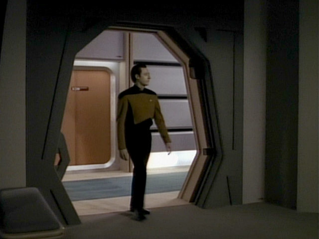 | The fake brig corridor can be seen again in this shot. The door previously appeared in main engineering aboard the USS Hathaway in "Peak Performance". Whenever the brig is seen in future episodes, the same corridor and door are seen. | ![]() "Peak Performance" |