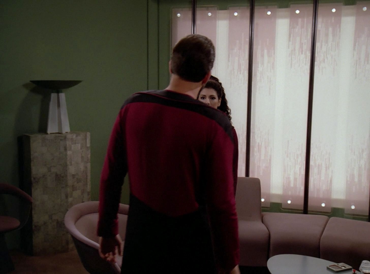 | Riker's Starfleet Academy Certificate (or a similar diploma) is seen in the background. | ![]() ![]() ![]() |