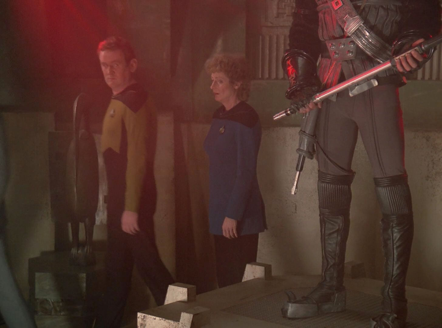 | Two Klingons hit Worf with their painstiks. In the two corresponding close-ups, however, they are not the same Klingons we see in the wide shot. | ![]() Close-up #1 |