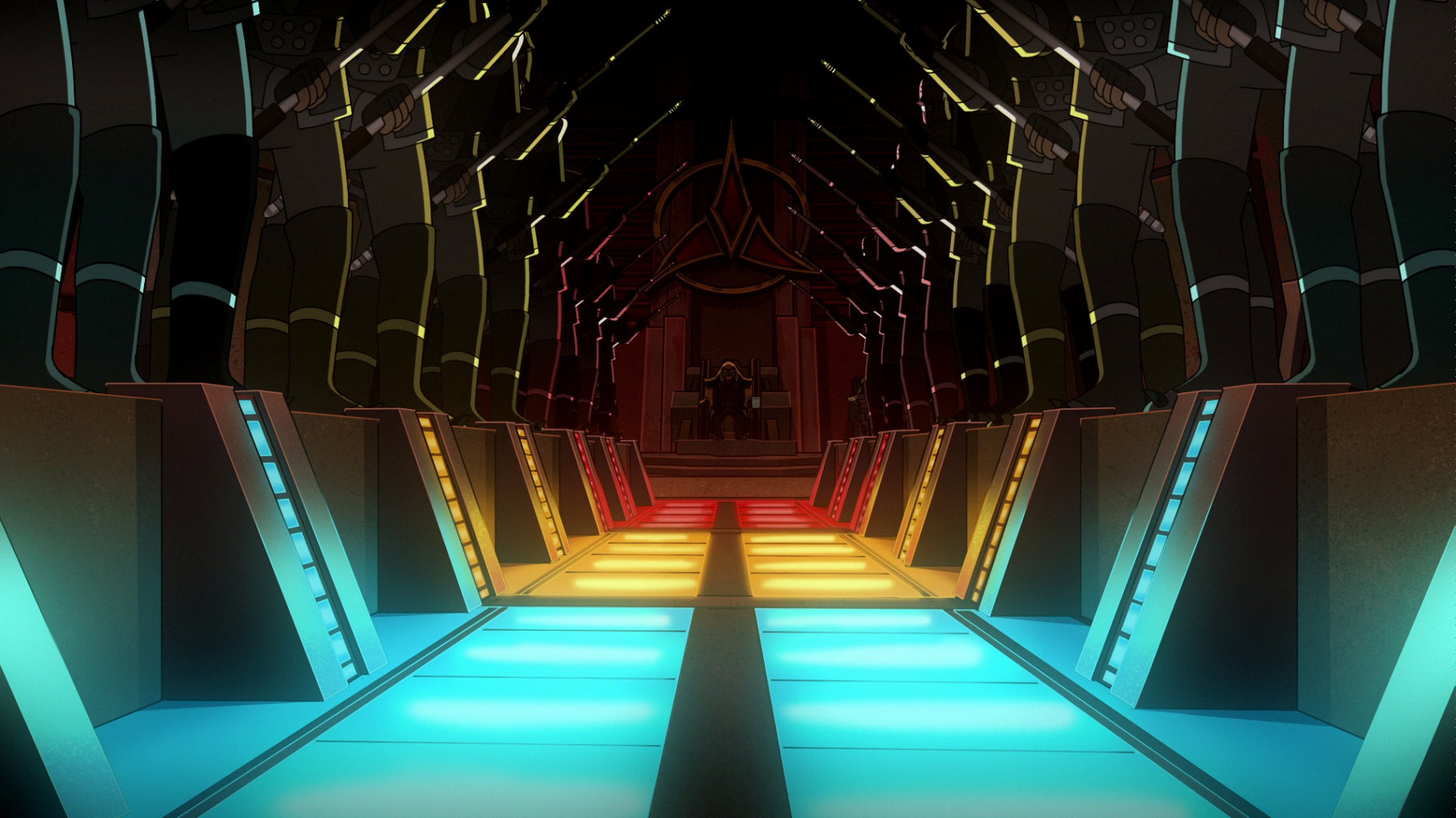 The large Klingon logo at one end of the Klingon Rite of Ascension Chamber will reappear in some later TNG episodes, such as "Sins of the Father", "Redemption I+II" (in the Great Hall), "Unification I" and "Aquiel". Many years later, the set can be seen again in animated form in LOW: "A Farewell to Farms". |