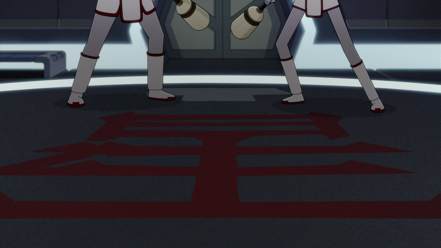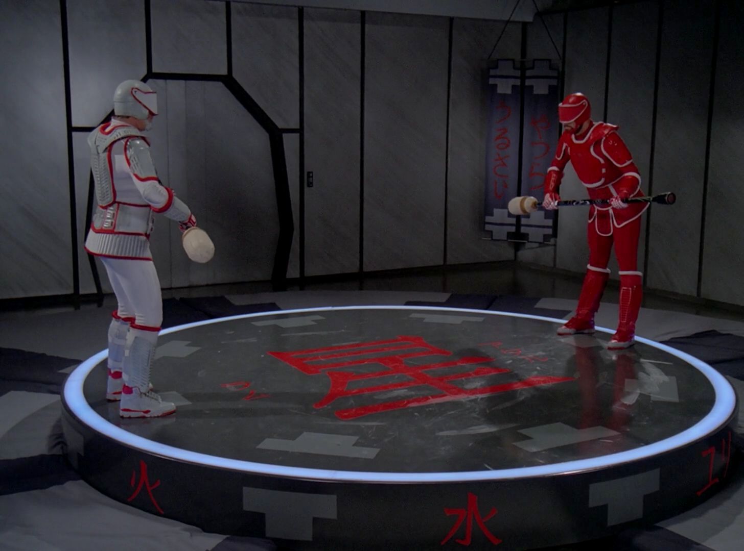 Some Japanese characters are legible in this shot. In some cases, they are references to the Japanese anime series SS Urusei Yatsura. The large character at the center of the ring is hoshi, meaning "star". The characters to the left and right of it mean "ramu" and "ataru", the names of the main characters of the series. On the banners behind Will Riker, we can read "Urusai" and "Yatsura". The central character in LOW: "Mugato, Gumato" is also hoshi. |
