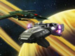 | This shot of the Jovis also appeared in the DS9 episode "The Circle" when the footage was re-used for the Kressari freighter Calondon in that episode. The red engine lights were turned off for the re-use and the ship flies backwards, though. | ![]() DS9: "The Circle" |