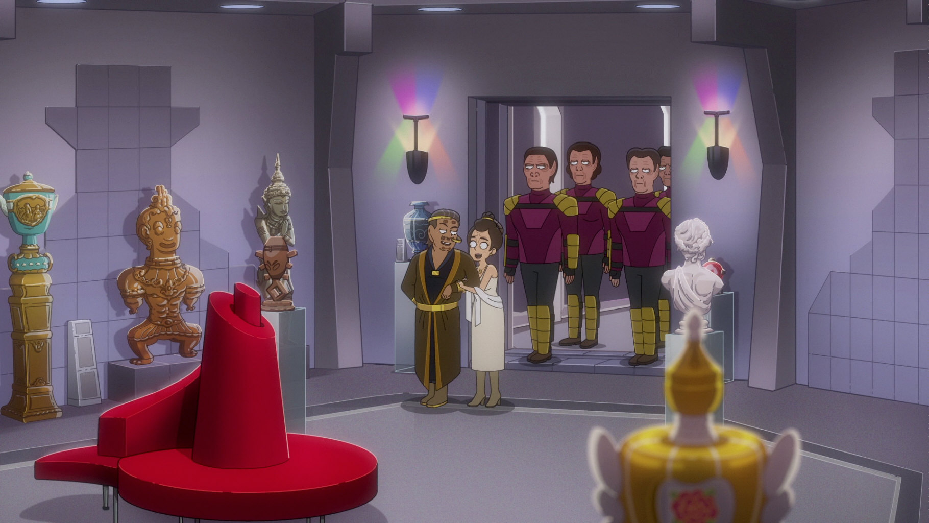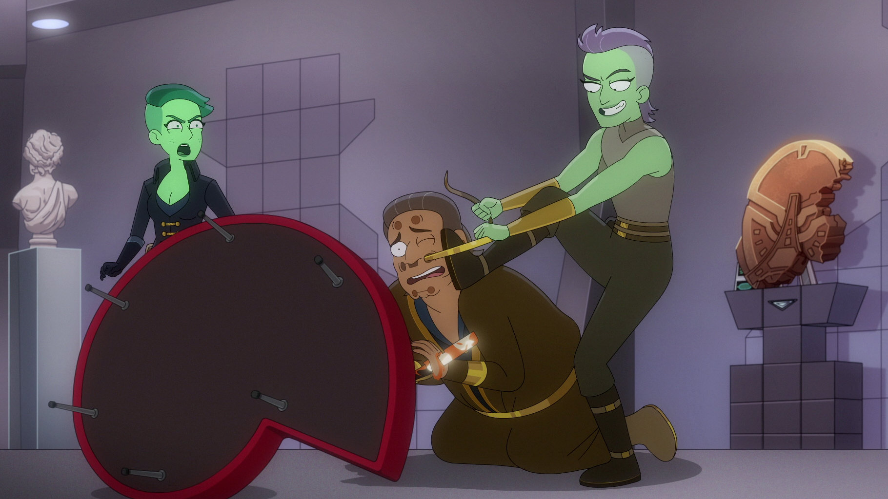 | We do not know the species of Palor Toff. But another member of his species appears in LOW: "Reflections", also as a collector and with similar clothes, including the odd headband. One more can be see in LOW: "Dos Cerritos", and one of Tendi's pirates pulls out the band from his nose, which is expectedly painful. | ![]() LOW: "Reflections" |