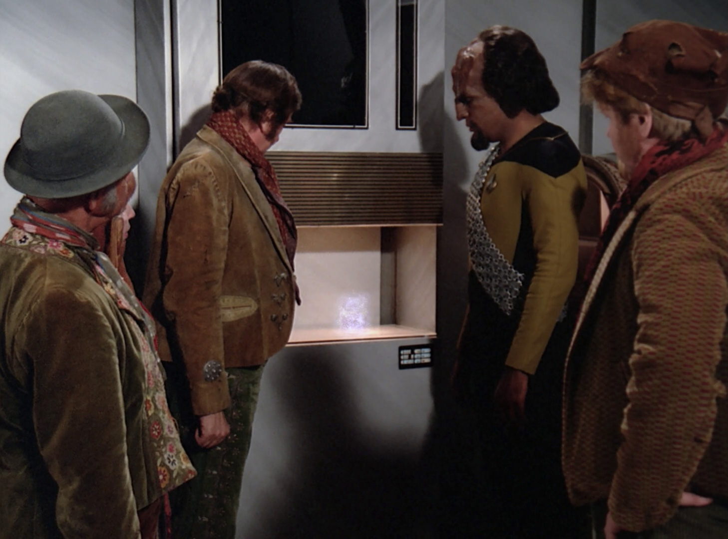 | Why did the chicken cross the corridor? We don't know but the bales of straw that are visible through the open door of the transporter room are gone when Picard enters just a couple of moments later. Did they quickly tidy up a little bit for the captain? | ![]() |