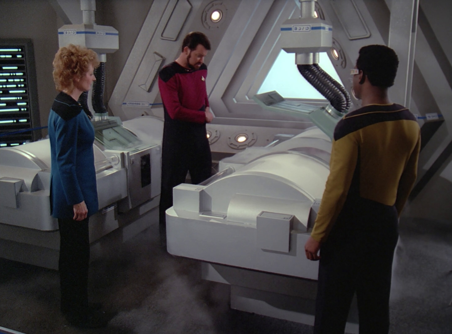 | One of the cloning units later appeared as a biobed in "The Best of Both Worlds II". A cloning unit also served as a biobed in "Transfigurations" and "Ethics". | ![]() "Transfigurations" |