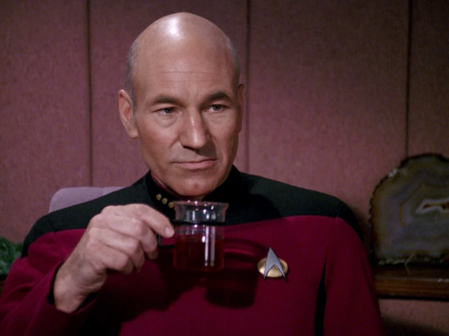 The replicator may churn out any beverage you want, but Picard remains loyal to a simple and traditional cup of Earl Grey - hot, of course. Later in life, he switches to the decaf version. I keep a stash of Earl Grey myself, though I'm not much of a tea drinker, except on those occasions when I raise a cup in honor of my favorite captain.