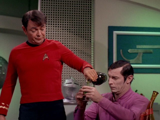 A drink with no name, just a color, is served by Scotty to incapacitate an unwelcome guest in TOS: "By Any Other Name". Data offers a green liquor from Guinan's stock to Scotty in TNG: "Relics", which Picard identifies as Aldebaran whiskey and which may or may not be the same beverage. There is still a mystery about the green original drink, which I hope will persist.
