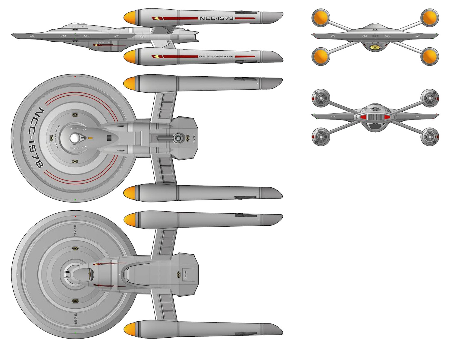 Some of the pictures from ST-Bilder.de, Propstore, Maurice Molyneaux, TrekCore, Igor Marić, Dávid Metlesits, Doug Drexler, Alexander DeLarge and Kris Olinger. Special thanks to Admiral Horton and to Chris G. aka RavenCWG for rendering many CG models. The PDF archive of the Eaglemoss Official Starships Collection is hosted at the Starship Schematics Database. Special thanks to Pundus for the kind support!